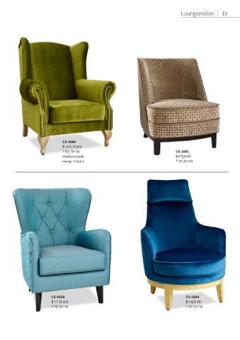 Loungemöbel | 19 cS-1680 B 100 | H 106 T 92 | SH 45 cS-1601 Mindestbestell- B 67 | H 84 menge 10 Stück T 75 | SH 43 cS-1650 cS-1604 B 77 | H 105 B 75 | H 88 T 75 | SH 46 T 90 | SH 38