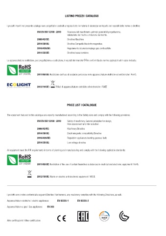 I prodotti inseriti nel presente catalogo sono progettati e costruiti a regola d’arte in materia di sicurezza nel rispetto dei requisiti delle norme e direttive: